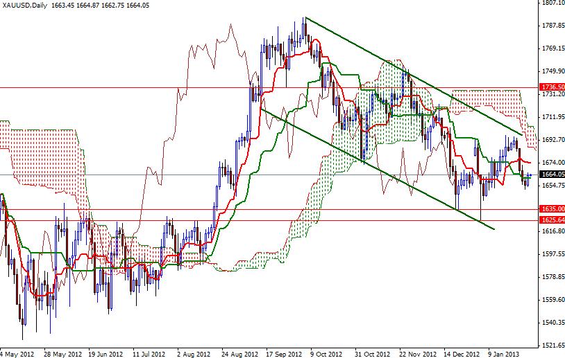 The XAU/USD pair paused its four-day decline as prices rebounded from 1652 to test the 1666 resistance level. The last few sessions saw bearish pressure due to fact that the bulls failed to penetrate a strong resistance at 1695. Yesterday's price action indicates that some market players are covering their short position prior to the Federal Open Market Committee announcement today. Disappointing consumer confidence data out of the United States was another element increasing the precious metal's appeal. Although sizable purchases by the central banks and lower interest rates seem to be gold supportive, large institutions have been betting on lower prices. Without doubt, the outcome of the FOMC meeting will be the next big market catalyst. Even though I do not expect any major changes in the U.S. central bank's easing policy, there is still a possibility that the policy makers would surprise the markets. Minutes of the FOMC’s previous meeting showed some of the voting members think it would be appropriate to end the asset purchases around mid-2013. Also bear in mind that the ADP Nonfarm Employment report and the first estimate of U.S. Gross Domestic Product (Q4) will be released today. Short term charts suggest that a retest of 1674-1675 is likely if the 1666-1668 zone is cleared. If the bulls climb above the 1675 level, which is the bottom line of the Ichimoku cloud on the 4-hour time frame, we could see another bullish attempt towards the 1685 level.