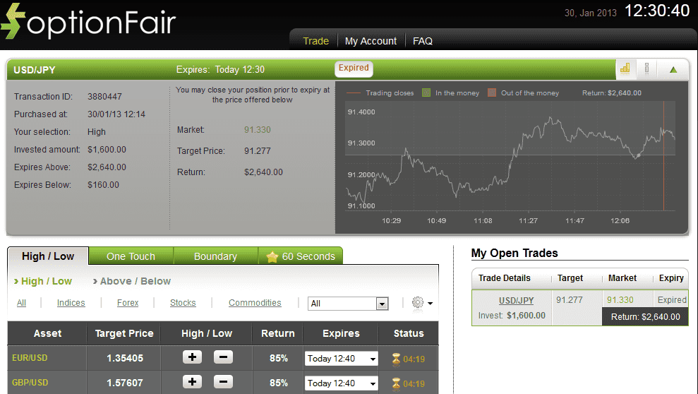 The market price for USD/JPY at the buying time (12:14) was 91.277 for the expiry time of 12:30. The asset closed at 91.330 and I made $1040.