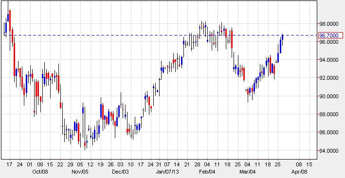 On the downside, I can see the $90 level as being very supportive, and as a result I think we are trying to form some type of range between $98 and $90. I would be willing to stretch that out as much is $100, but not any farther. If we can get above $100, that would below the range theory out of the water. So right now, I am looking for more strength for the short term, but think over the next couple of sessions we should get some type of resistive candle that is a sellable event.