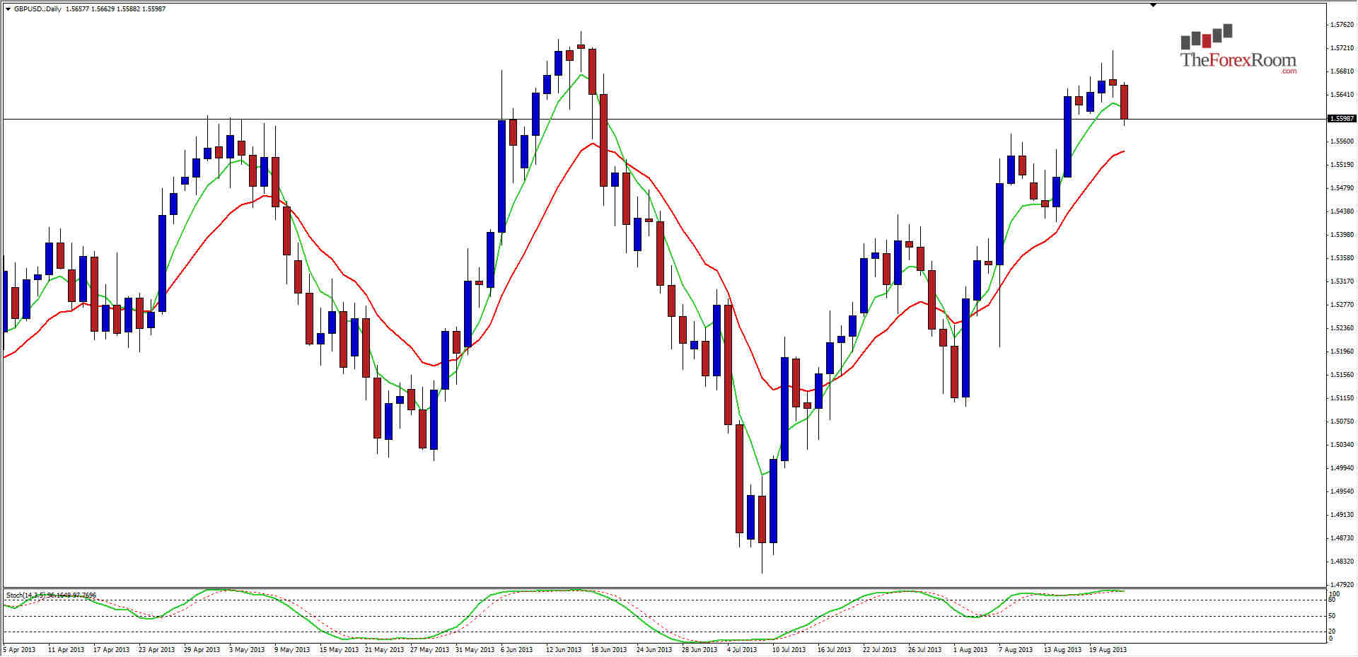 The GBP/USD printed a daily Hammer, or Pin Bar off of previous highs set back in June when the pair topped out at 1.5751 and the Weekly R1 at 1.5717. Yesterday’s price action made it as high as 1.5717, so a lower high at this point with the Stochastic showing a higher high that June by a fraction. This is what is known as Bearish Divergence and can also be seen using a MACD if that is your preference.
