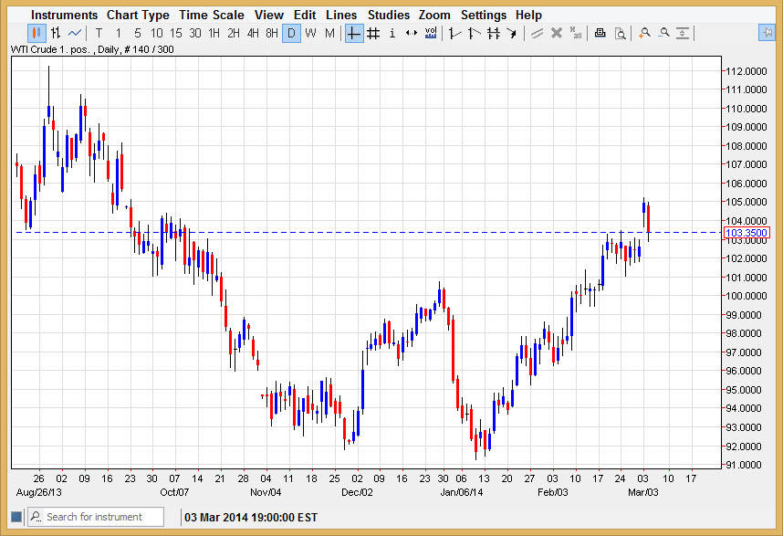 Be aware the fact that headlines coming out of the Ukraine could move this market back and forth. Ultimately, I believe that the Russians simply “pushed things along” when it comes to the value of oil, as this market already looked like it was ready go higher. Because of this, I feel that this is essentially going to be a one-way market given enough time, but there will be hiccups along the way. It really comes down to whether or not you can hang onto the volatility, as I believe that there is a significant amount of money to be made. You could do this in the options market if you can’t handle that type of volatility, or of course if you have the ability to trade the CFD markets, you can always keep a small position. Nonetheless, I see no reason why this market should go too much lower.