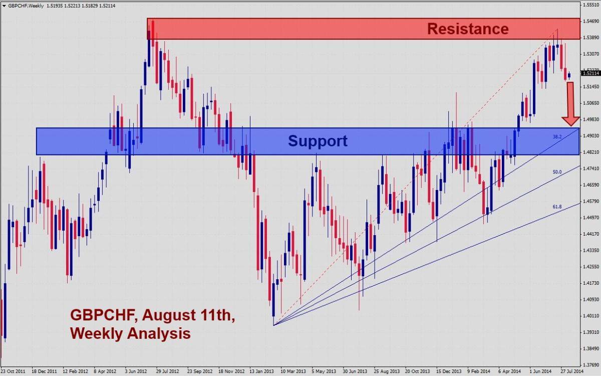 The GBPCHF has rallied over the past 18 trading months. The correction took this currency pair from an intra-day low of 1.3965 to an intra-day high of 1.5433 from where it started to move lower. This currency pair has formed an imperfect double top formation which is a bearish chart pattern and forex traders should expect the GBPCHF to correct slightly further from here until the correction is stopped by double support levels.