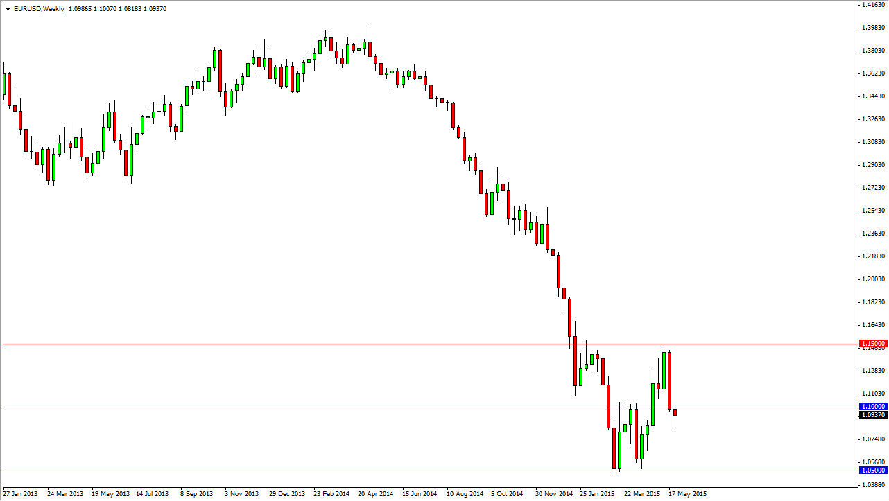 Traditionally, summertime is rather range bound for currency markets, and because of this it would not surprise me at all to see this market bounce around in this region. It is an extraordinarily wide region, but I think that we are more apt to see the Euro pick up a little bit if we can get above the 1.10 level. After all, the Euro has been beaten down so hard that somebody will find value in this currency sooner or later