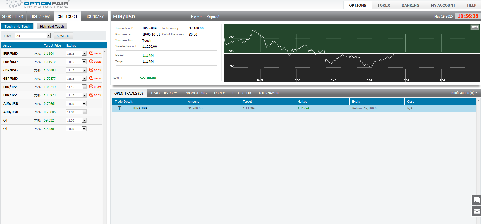 I logged in the OptionFair™ binary options trading platform and I traded $1200 on the "Touch UP" instrument. This kind of option has a return of 75% if the option touches the strike price prior to expiry, which means that if the signal is correct, I could get a return of $900 on my investment.