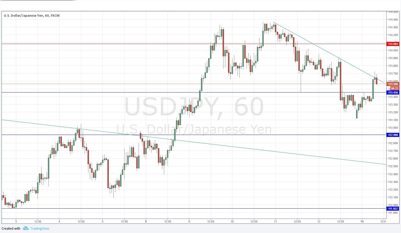 The price has pulled back, and is held down by a short-term bearish trend line. For the long-term bullish trend to reassert itself, the price really needs to get established above this trend line, and at the time of writing, the price is failing there, suggesting that the high of the day may have already been reached, although the broken level at 113.46 might hold as support. This pair still has the most volatility of any major Forex currency pair and has risen significantly since the market opened this week.USDJPY