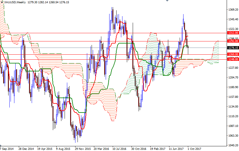 XAU/USD traded as high as $1276.30 after employment data showed that the U.S. labor market shed 33000 jobs in September. Data also revealed that average hourly wages increased 0.5% and the unemployment rate dropped to 4.2% from 4.4%. Market expectations are high that the U.S. central bank will hike rates again in December but investors doubt that the Fed will raise borrowing costs three more times next year. From a chart perspective, trading below the Ichimoku clouds on the 4-hour chart implies that the bears have the short-term technical advantage. However, the long lower shadow of Friday’s candle, along with the fact that prices are still above the weekly cloud, suggests we shouldn’t rule out a rebound in gold.