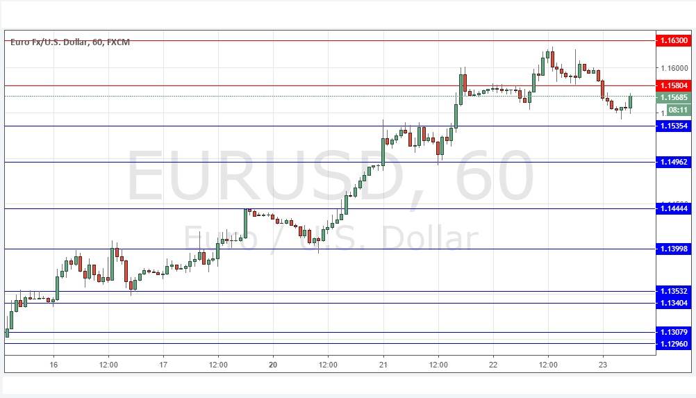 Yesterday’s signals were not triggered, as none of the key levels were ever reached, although the price did make a high only a few pips below the resistance level identified at 1.1630.