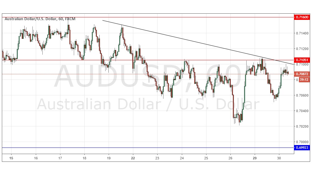 I wrote yesterday that it was hard to see any key levels within a very wide, almost 200 pip range, except for 0.7105 which was holding the price down, but also looked very likely to break and become invalidated soon. For this reason, I did not want to use it as a level, but if the price stalled and fell from that level it might have given a short trade opportunity.