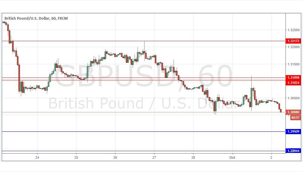 I wrote last Thursday that the movements in this pair GBP/USD are less predictable as there is a Brexit wild card in the value of the British Pound. I thought it would be more useful to trade the EUR/USD that day than this pair. As it happened, there was little difference between the two currency pairs, with both trending down quite smoothly and breaking support. Today, the action is clearly bearish, although the movement is obviously stronger in the EUR/USD currency pair. The price here remains sensitive to British political developments as Britain’s Brexit approaches its moment of truth, and the governing Conservative Party’s conference is currently running, producing more rumours than usual. Technically, the action is bearish, but it may be that the large round number here at 1.3000 will hold so that is something for bears to watch out for. I would be extremely reluctant to take any long trade however unless there is a strongly bullish bounce at 1.2950.