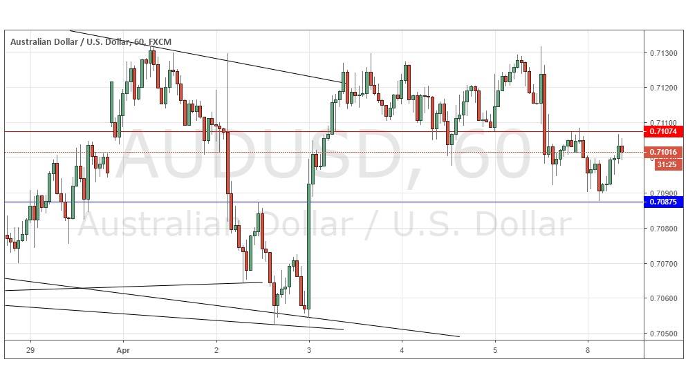 - Go short following some bearish price action on the H1 time frame immediately upon the next touch of 0.7107 or 0.7144.