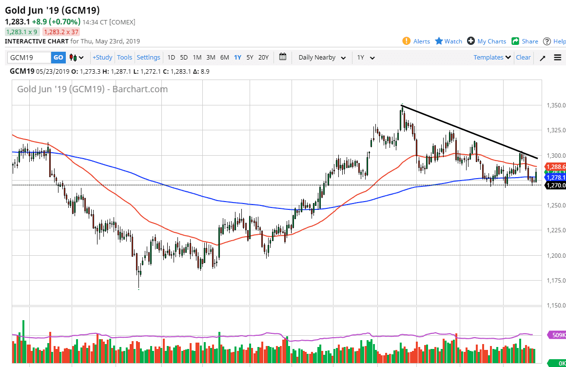 Gold market of course was reacting to the insane moves in the S&P 500 and probably more specifically the oil market, as fear gripped traders around the world due to the trade war between America and China. That being said, there are plenty of reasons to think that sellers are waiting above, not only due to the shorter-term charts, but the fact that the 50 day EMA did in fact hold as resistance. Beyond that, there is a downtrend line that is closer to the $1300 level, and that of course is a major barrier due to not only the downtrend line and the large, round, psychologically significant level.