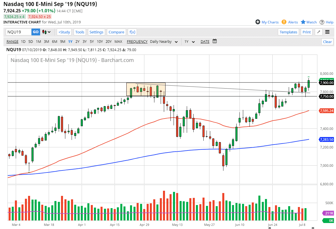 The NASDAQ 100 initially pulled back a bit during the Wednesday trading session, testing the 7800 level. The market then rallied significantly and reach above the 7900 level. Ultimately, we have broken to a fresh, new high, and therefore it’s likely that we are going to go to the 8000 level given enough time. This is a market that has been strong for a while now, and the fact that the market has broken out suggests to me that we have further real estate to cover.