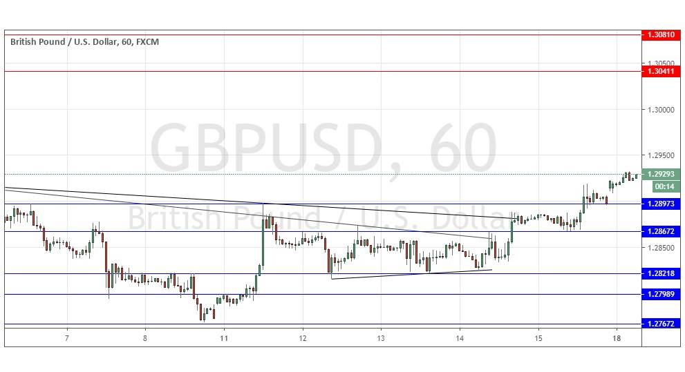 I wrote yesterday that respecting the triangle formation, I saw a breakout above 1.2870 as a bullish sign, and a breakdown below 1.2822 as a bearish sign. This was a good call, as we got a bullish breakout above 1.2870 which has led to a rise of about another 50 pips since.