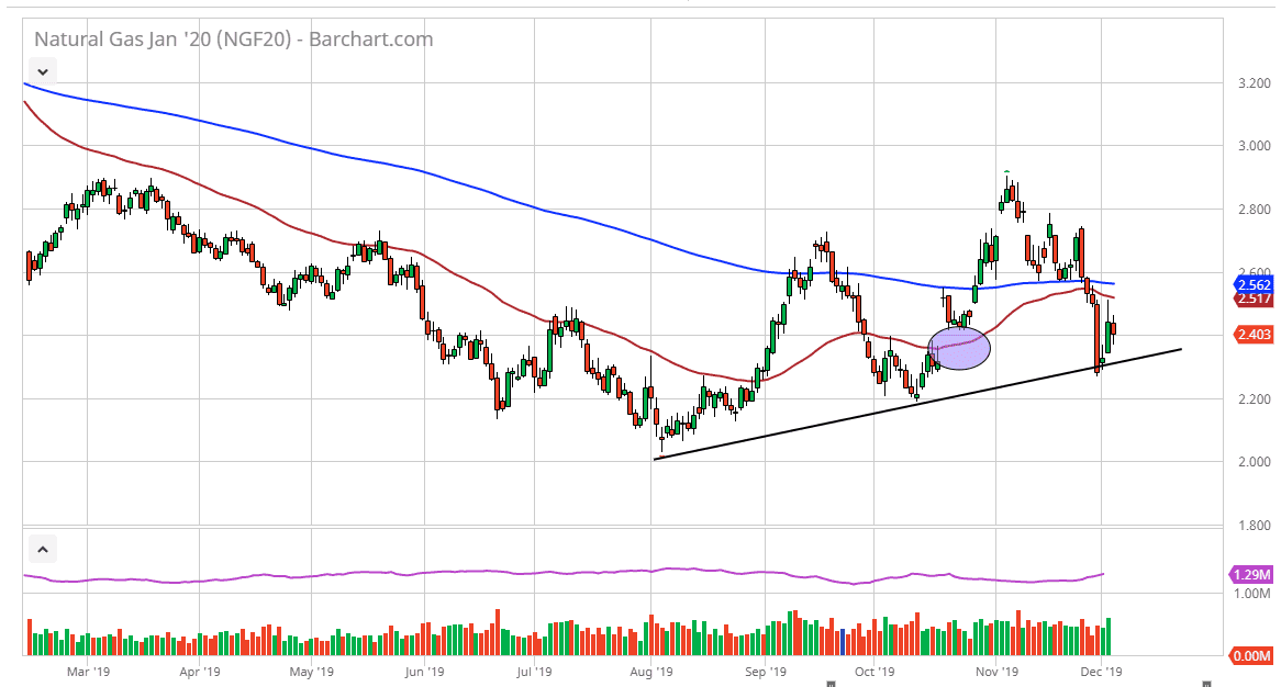 Underneath, the uptrend line should continue to keep this market afloat, and it should also be noted that the Friday session from last week selling off was due to not only negativity, but also a lack of volume. Remember, it was the day after Thanksgiving, so volume would have been a major issue. All things being equal, the market has been rising over time and I think it’s only a matter of time before we continue to see a lot of buyers. The lows are getting higher, just as the highs are. Ultimately, this is a market that is very seasonal, and this time a year tends to be relatively strong. That being said, US drillers had produced almost 14% more than the previous year, so it is taking quite a bit more work to chew through the supply in order to get that winter pop that we normally see. That tends to send this market somewhat parabolic, but so far, we still see quite a bit of supply. Given enough time though, the market should go higher, and this time of year is most certainly a better time to be buying then selling. Overall, it’s not until the middle or late part of January that I start to look for shorting opportunities. Pay attention to the trend line underneath, it should continue to have an effect on the market.