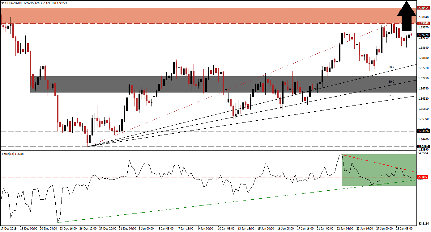 As a result of the advance in this currency pair, the support zone continues to be elevated, as the Fibonacci Retracement Fan is redrawn. The current support zone is located between 1.96589 and 1.97329, as marked by the grey rectangle. It is enforced by the ascending 50.0 Fibonacci Retracement Fan Support Level, pending another upgrade as the GBP/NZD is attempting to retake the critical psychological 2.00000 resistance level. Economic data out of the UK showed signs of improvement, especially in the labor market, adding to bullish fundamental developments.