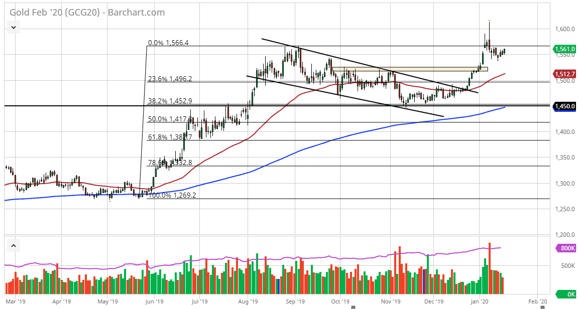 Gold markets have rallied a bit during the trading session on Friday, reaching towards the $1560 level. This is a market that continues to find plenty of buyers, and I do think that we are going to be bullish over the longer term. However, this is a market that has a lot of resistance just above so don’t be surprised at all if it takes a while to finally break out. Short-term pullback should continue to be buying opportunities, as the momentum may have gotten a little bit ahead of itself. Keep in mind that the big spike on the shooting star was based on all of that noise coming out of the missile strike by the Iranians against the Americans. We have since calmed down, but you will notice how we are still going higher.