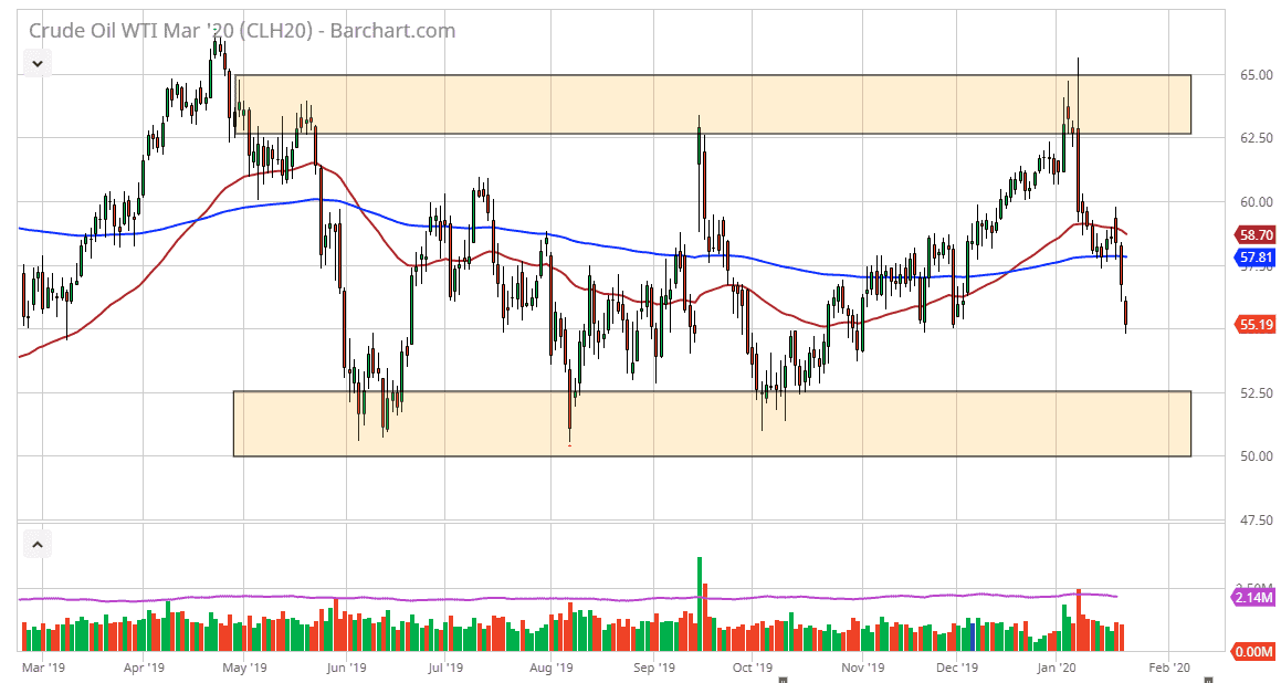 Looking at the overall picture though, you can see that the market has been consolidating between the $65 level on the top and the $50 level on the bottom. Overall, this is a market that is very noisy, but is still hanging in the same general vicinity. Even though we have fallen hard of the last couple of weeks, the reality is that we are still very well within the tolerances of the consolidation of the last several months. That being said, it does look like we are going to try to go to the downside, reaching towards that $52.50 level.