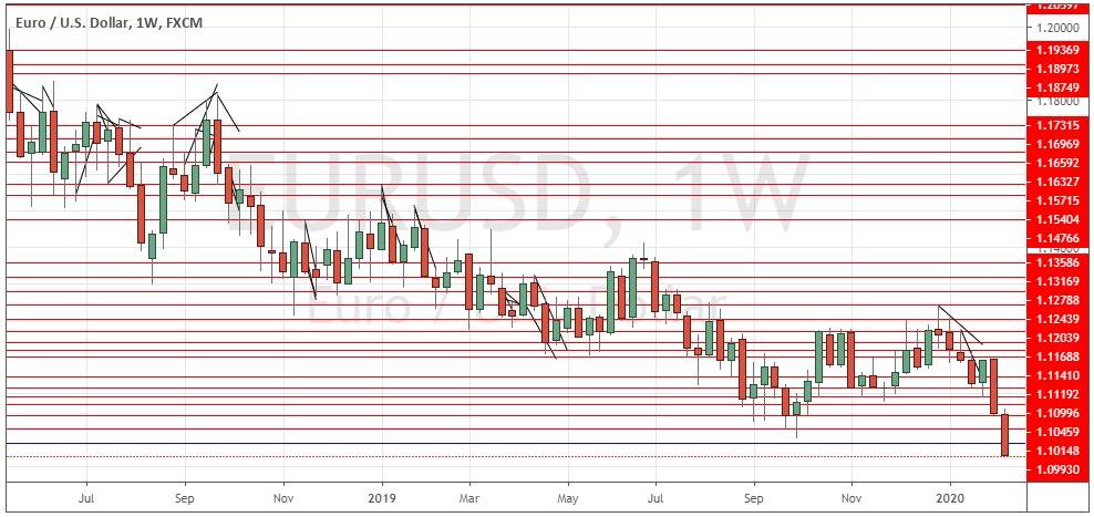 The EUR/USD currency pair just made its lowest weekly close in nearly three years. The weekly candlestick was large and closed right on its low, which are bearish signs. There is a slow but strengthening convincing long-term bearish trend and the price looks likely to fall further over the coming week.
