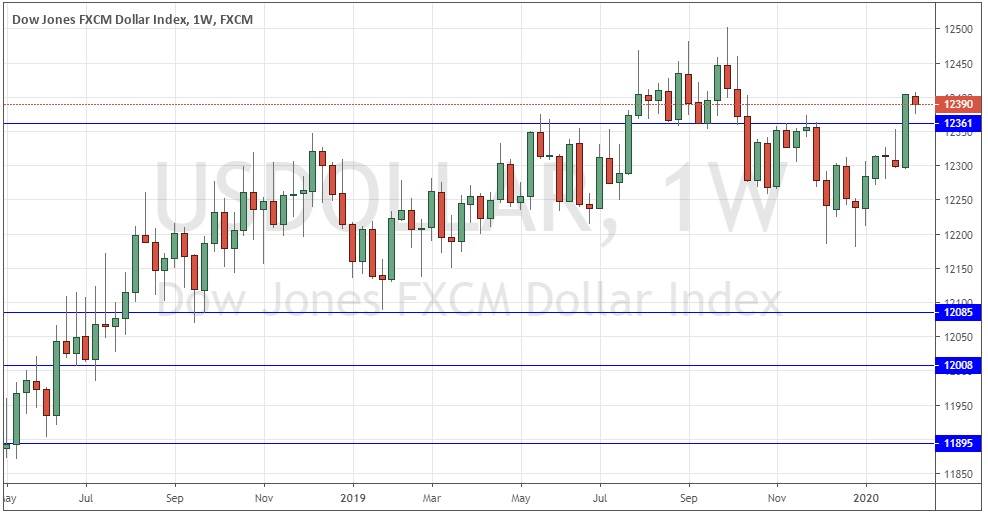 The weekly price chart below shows last week printed a small and slightly bearish candlestick. However, the bearish retracement represented by this candlestick was small, and the support level at 12361 has continued to hold, which are bullish signs. The long-term trends are now more bullish, with the price only just below its level from 6 months ago and clearly above its level from 3 months ago, which indicates a weak but basically bullish trend. Therefore, there is technical evidence that we are likely to see a further upwards move in the U.S. Dollar Index next week.