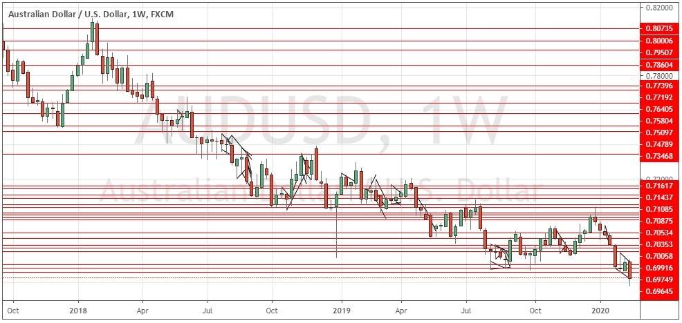 The AUD/USD currency pair just made its lowest weekly close in eleven years. The weekly candlestick was large and closed within the lower third of its price range. These are all bearish signs, and the price looks likely to fall further over the coming week. However, it could be wise to watch shorter time frames and not be bearish until the price is falling on those time frames as last week ended with a bullish retracement.