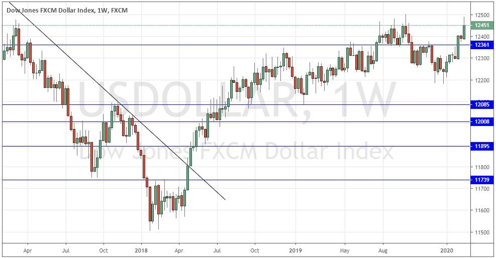 Gold in U.S. Dollar terms just made its highest weekly close in seven years. The weekly candlestick was very large and closed very close to its high. These are all bullish signs, and the price looks likely to rise further over the coming week.