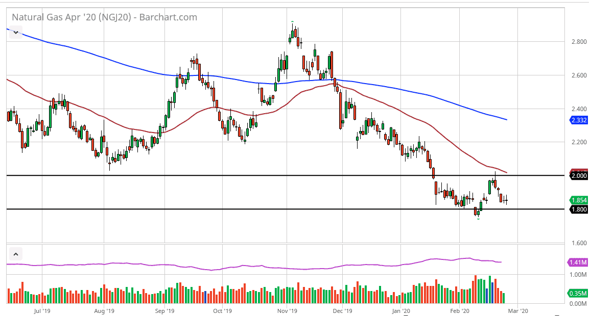 If the market was to break down to a fresh, new low, then the market will more than likely go down to the $1.60 level underneath and test what has been a longer-term support level. In the meantime, though, I suspect that we are probably going to trade in a $0.20 range between the $1.80 level and the $2.00 level. Expect a lot of volatility in this area, as traders are trying to express what the markets are going to do, but at the same time we are at extraordinarily low levels so it’s very difficult to get short at this point. Waiting for rallies to show signs of weakness is probably the best way to go going forward, at least until we get those bankruptcies in America that are so desperately needed. There are far too many suppliers and drillers out there to expect that supply is going to suddenly dwindle away, especially considering that we are heading towards the warmer time of year.