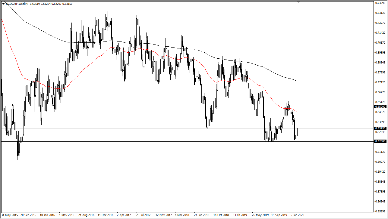 The New Zealand dollar has rallied significantly during the week, especially against the Swiss franc as it is testing a major area of resistance. If we can break above the highs of this past week, I believe that the New Zealand dollar will continue to go towards the 0.65 handle. Otherwise, I would anticipate a range bound market and I do see the 0.62 level as an area that will continue to be massive support. If we drop towards that area you may find some value in that region to start buying again, as the market has shown this area to be very important.