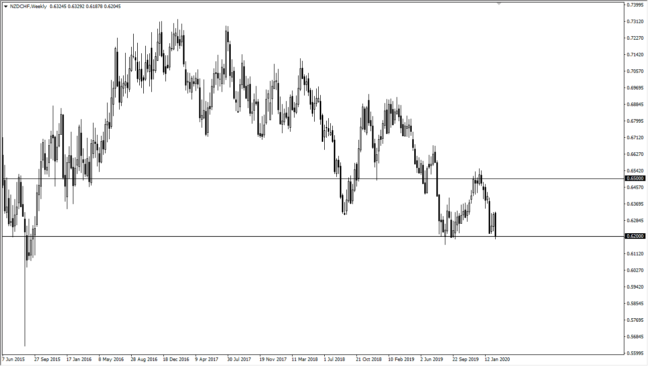 The New Zealand dollar had a rough week against the Swiss franc, showing a very “risk off” type of scenario. The 0.62 level has been very supportive, so I think it’s only a matter of time before we break down and reach towards the 0.60 level. At this point, the market will continue to sell rallies, as quite frankly there is a lot out there that people are concerned about. Looking to fade exhaustion after pops will probably continue to be the way people take advantage of this “risk on/risk off currency pair.” All things being equal, I don’t trust rallies.