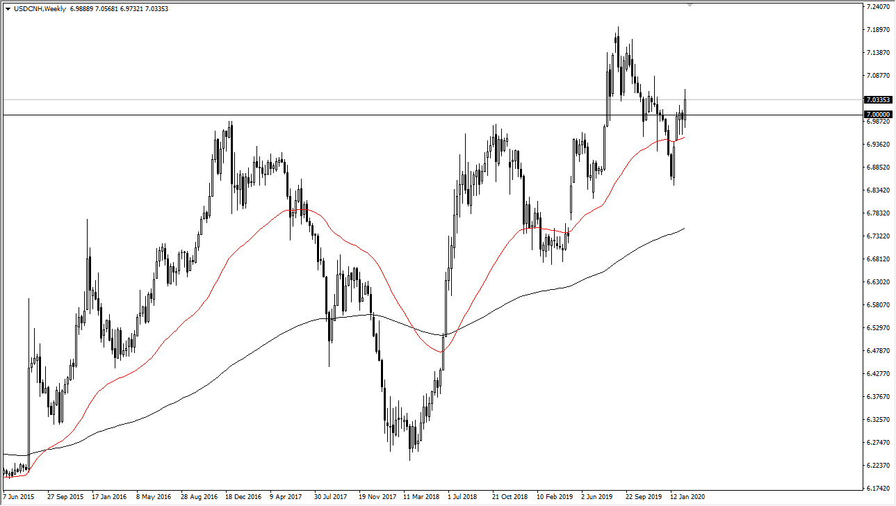 The US dollar rallied against the Chinese Yuan during the week, breaking above the 7.0 level yet again. Ultimately, the market looks as if it is going to go back towards the highs which makes quite a bit of sense considering that the coronavirus is still raging for China, and of course the US dollar is a bit of a safety currency. Furthermore, the US economy continues to look relatively strong and although the PMI numbers were a bit soft during the trading session on Friday, the reality is that it’s not China, and that’s really all that matters. The Chinese Yuan will more than likely continue to lose strength, as the uptrend continues to show just how favored the US dollar is in general.