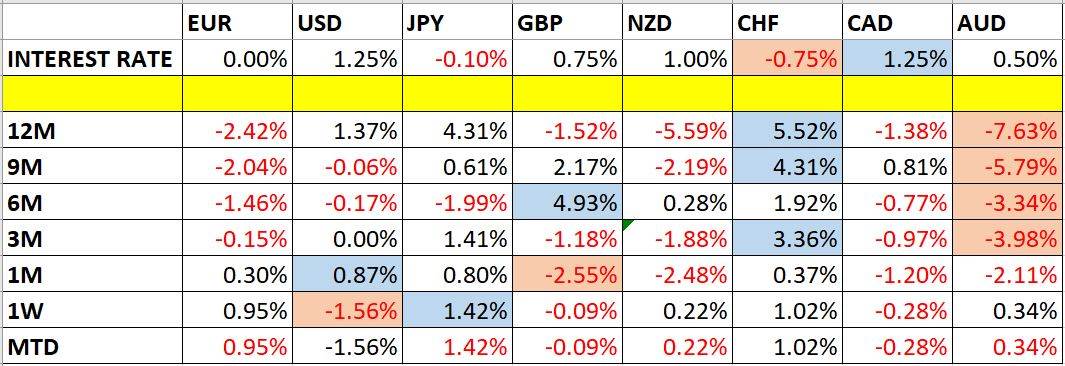Let’s look at the relevant data of currency price changes and interest rates to date, which we compiled using a trade-weighted index of the major global currencies: