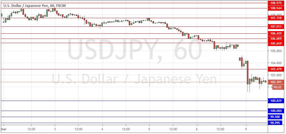 Bottom line: there is no reason to be bullish at all and volatility is very high. It is very likely the price will fall further and price action over the short term will be dominated by downwards impulsive moves. The best strategy to trade this pair, which is the key Forex currency pair right now, is to either wait for a reversal at 103.48 on higher time frames such as the hourly, or to trade reversals from bullish pullbacks on very short time frames. Position size should be kept low due to the high volatility.