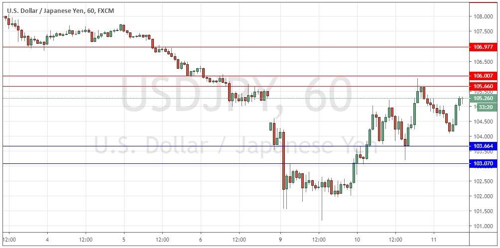 Yesterday’s signals produced a nicely profitable short trade from the bearish rejection of the resistance level I had identified at 105.66, which gave a maximum reward to risk ratio so far of approximately 2 to 1.