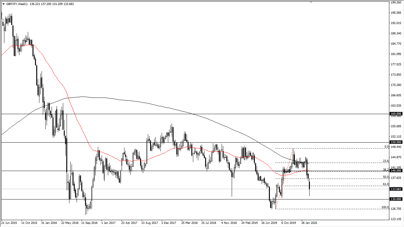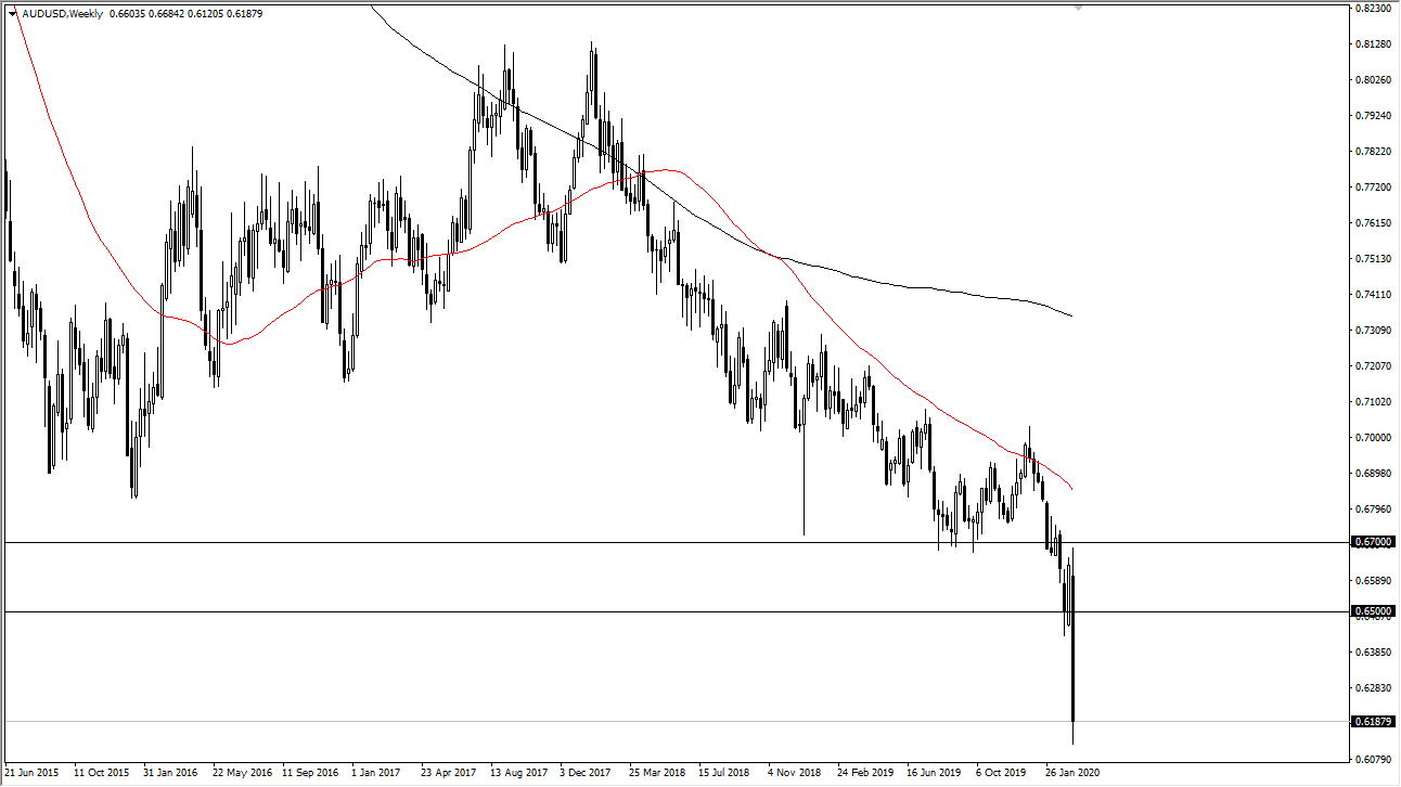 The Australian dollar has fallen apart during the week, breaking well below the 0.65 level and even crashing towards the 0.62 level. The 0.60 level underneath is massive support based upon the financial crisis bounce, and we are actually that low now. I think we will probably see a short-term rally if we get any type of good news, but I find it very hard to think that the Aussie is going to break above the 0.65 handle anytime soon. I continue to fade rallies.