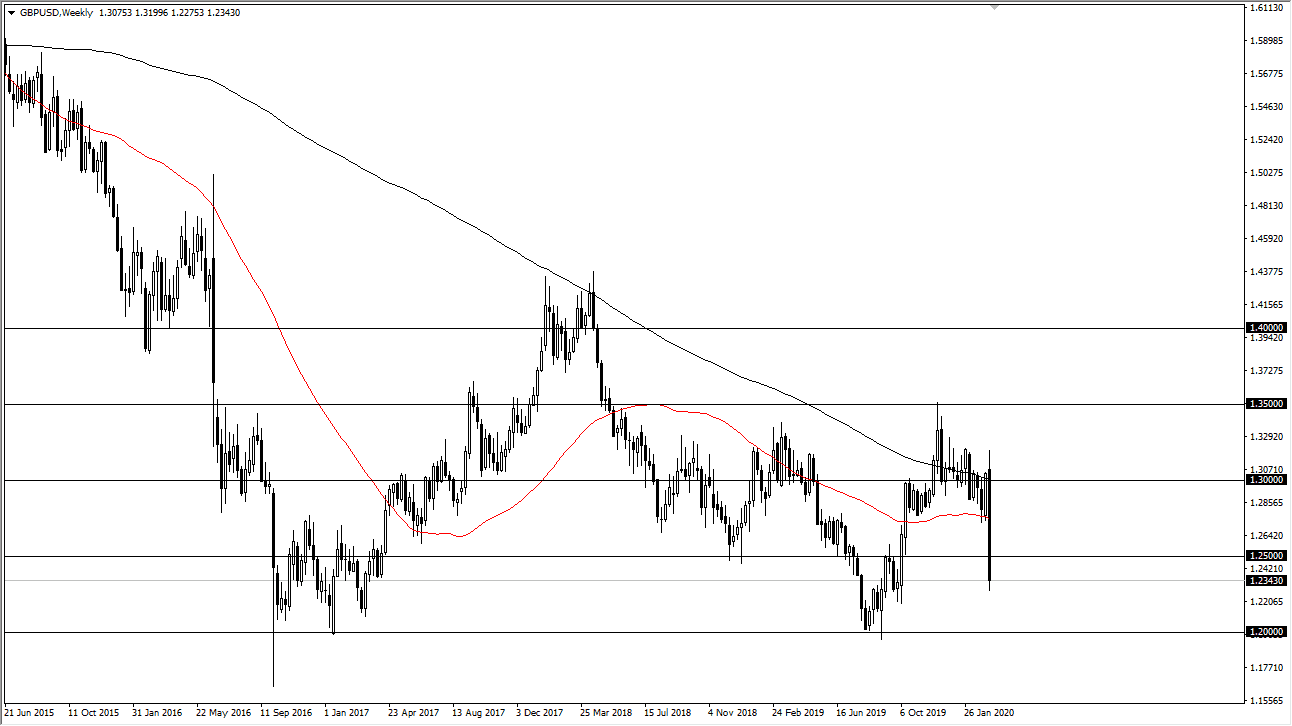 The British pound had a horrific week, slicing through the 1.25 level. Furthermore, Friday even saw the market reach down towards the 1.23 level. I think at this point we are probably going to see a little bit of a bounce from the British pound, but I believe that the sellers will return at the 1.25 handle. If we break above there, then the British pound probably goes looking towards 1.2750 level. One thing is for sure, this is a negative candlestick, and it certainly shows that there is probably more selling to come.