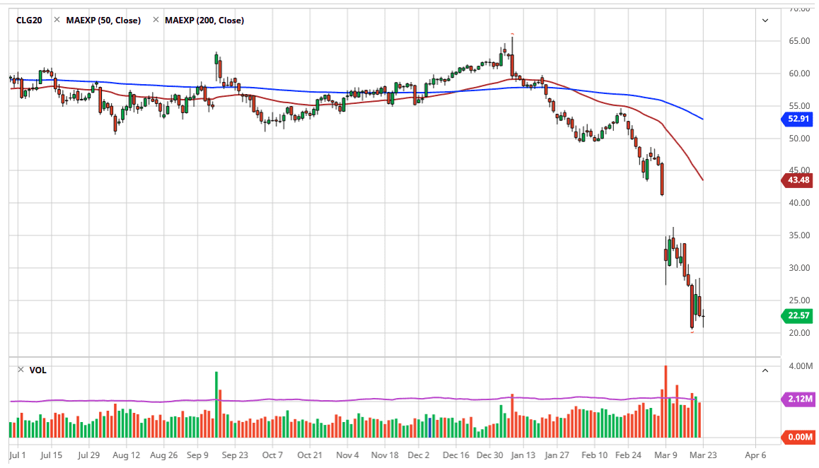 The West Texas Intermediate Crude Oil market initially fell during the trading session on Monday to kick off the week, as we continue to see a serious lack of demand for the commodity. However, the closer we got to the $20.00 level, the more buyers showed up to turn things back around and pick the market up. Ultimately, the candlestick for the day ended up being a bit of a hammer but I think this is going to be a short-term bounce more than anything else. There are a lot of structural issues when it comes to energy right now, most of which are anywhere near being able to be dealt with.
