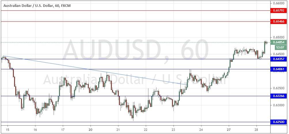 I take a bullish bias on this currency pair today, but I note the price is already very close to the round number at 0.6500 which might halt the advance, at least for a while.