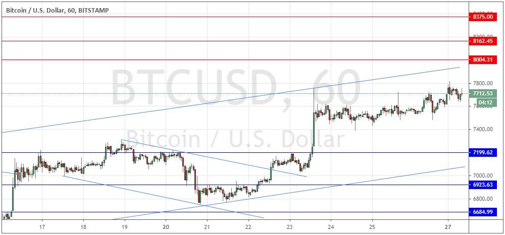 I would be prepared to take a cautious short trade from $8,000 but until that level is hit I expect the price is most likely to rise over the coming day.