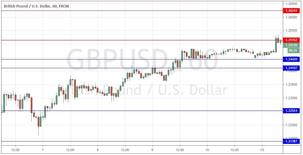 The price has gone on to rise in line with its medium-term trend and within the past few hours it has broken temporarily above the key resistance level at 1.2515 to a new 2-week high price. Although this bullish move may be short-lived, it seems to signify that the bulls have the upper hand for now, so I would be happy to take a long trade today at a bounce at any support level which is reached. Such a trade would be better taken after the New York open as the U.K. is on holiday today so trading in London is likely to be a little thin.
