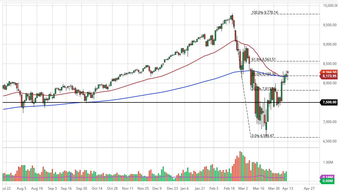 The NASDAQ 100 does lead the way going forward most of the time, so this could be a bit of an indicator for the S&P 500 and the Dow Jones Industrial Average markets as well. Tech seems to lead the way most of the time, so be aware of that could be the case here as well. For what it’s worth, the candlestick is rather bullish looking so I do lean a little bit more to the upside right now but if we were to turn around and breakdown below the candlestick for the trading session on Monday, that would make it a “hanging man”, which is a very negative candlestick. At that point, one would have to think that the market is going to go looking towards the 8000 level, and then eventually the 7500 level where I see an absolute ton of support based upon the most recent surge higher.
