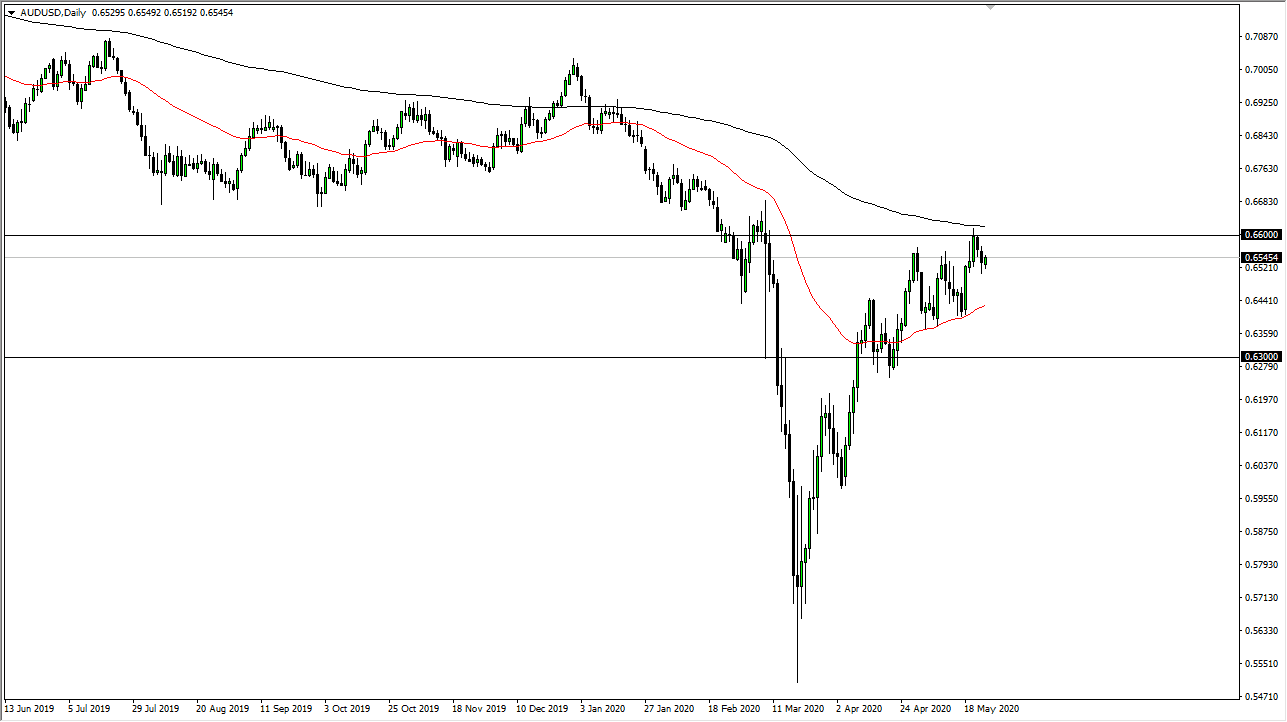 The Australian dollar has rallied a bit during the trading session on Monday in very thin holiday trading as it was Memorial Day in the United States and a bank holiday in several other countries, including the United Kingdom. Because of this, you cannot read too much into the candlestick on Monday, as it will have more or less been retail traders, and not necessarily big institutions. Nonetheless, we are at extreme highs and we have seen quite a bit of a fight up here near the 0.66 handle.