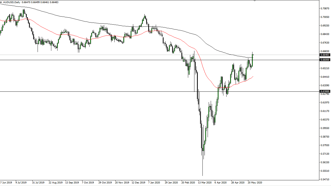 The Australian dollar has exploded to the upside during the trading session on Tuesday, breaking above the 200 day EMA and even managing to close above it. That being said, we also have a lot to worry about in the form of 0.67, which was the scene of massive selling. If we can break above there, then it is likely that the Aussie will continue the longer-term move to the upside. However, the Australian dollar has gotten ahead of itself as you can see, so it will be interesting to see whether or not we can continue this momentum. If we can, then that is an extraordinarily strong signal.