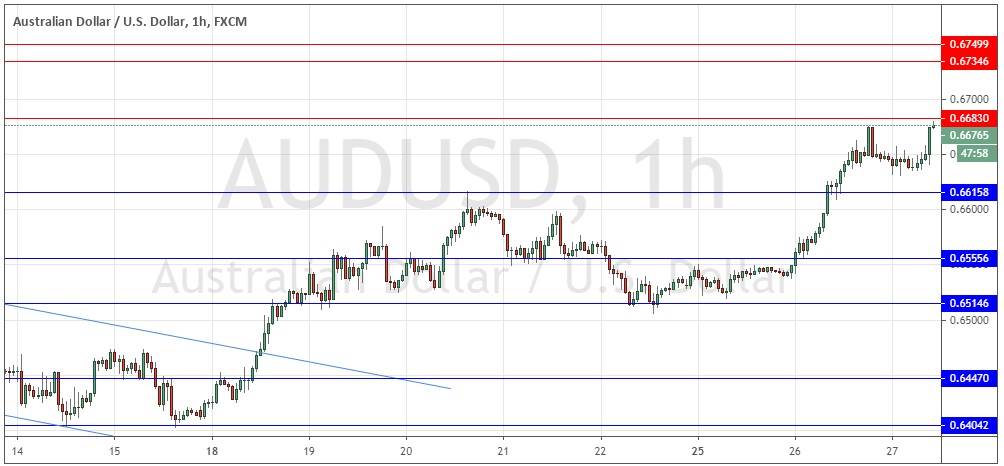 The price is just under the key resistance level at 0.6683 as at the time of writing, so is likely to need a bearish retracement before it can rise again. I would be very happy to take a long trade following such a pullback to 0.6616 followed by a bullish bounce.
