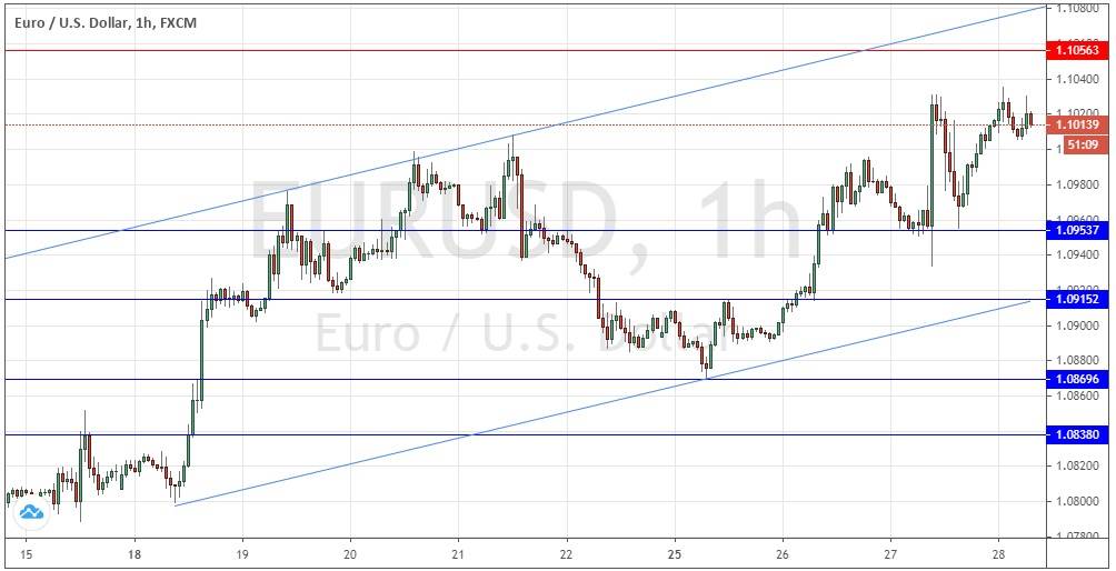 I wrote yesterday that although the price was likely to rise over the course of the day, we were still liable to see resistance at the big round number of 1.1000 so a strong bearish reversal there is a possibility. I would be careful remaining in a long trade when 1.1000 is reached. However, I was happy to take a long trade from a bullish bounce at 1.0954.