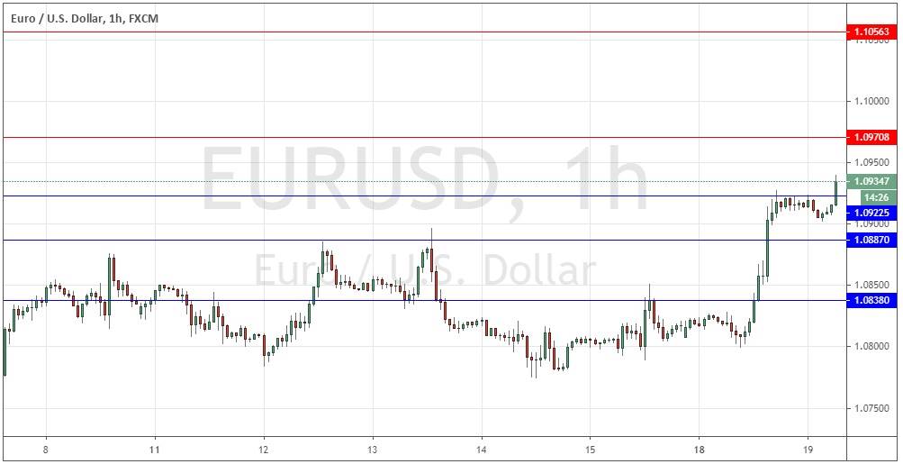 I wrote yesterday that the consolidation pattern had become slightly bullish, and I thought the price may break suddenly above 1.0836 and rise quite quickly to the next resistance level at 1.0887 over the day. That was a good call as the price reached and quite quickly exceeded 1.0887, although I was wrong about looking primarily for short trades and expecting that the day would not be very active in this pair. It was a strong mover on what would typically be a quiet Monday.