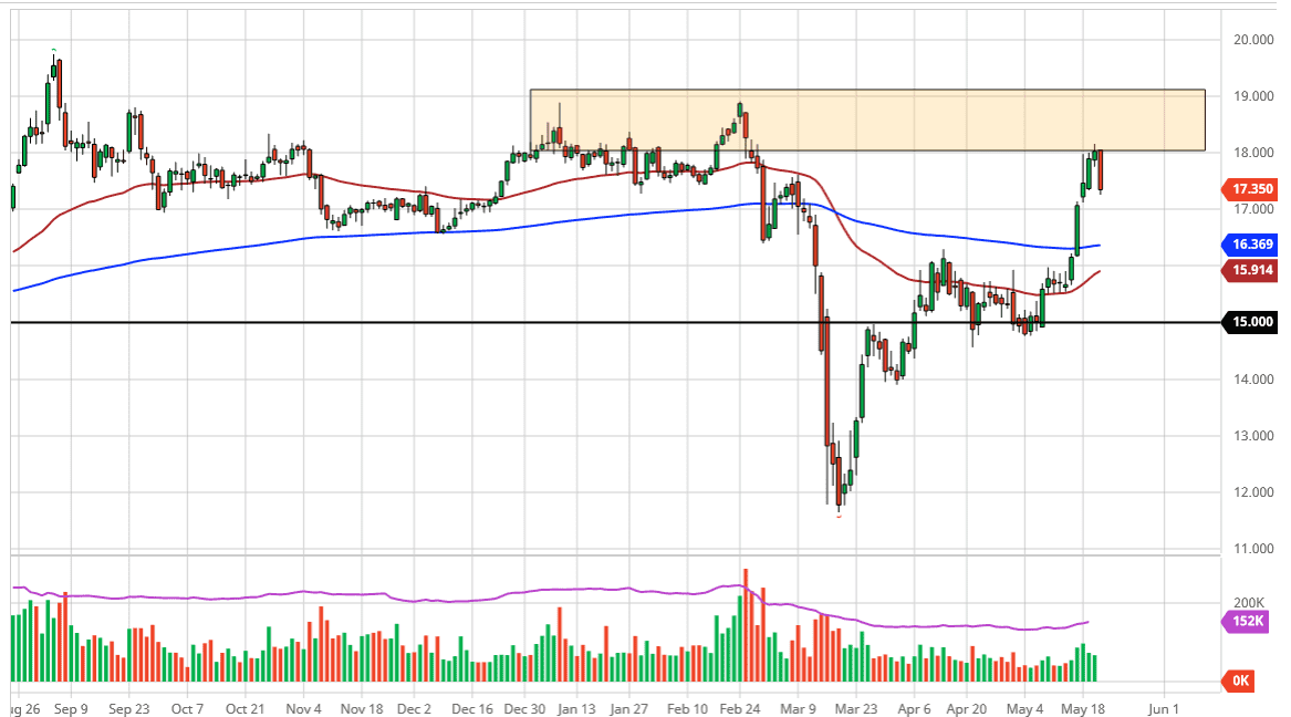 The silver markets fell rather hard during the trading session on Thursday after testing the $18 level. This is a large, round, psychologically significant figure that of course will attract a lot of attention. At this point, the market also is testing a gap from back in February that sits just above the $18 level. After reaching towards that area, you can see that we have pulled back quite a bit. The open pit session closed at roughly $17.40, and it looks like we have further to go to the downside. There is a gap underneath that still has not been filled yet, which is closer to the $17 level. Because of this, I fully anticipate that we will probably continue to go a little bit lower. This does not necessarily mean that we are going to collapse completely, but clearly a pullback is definitely needed.