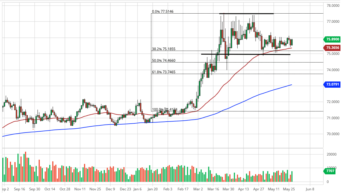 Looking at the chart, the ₹76 level has offered significant resistance, but I do think that it gets broken eventually. It looks as if there is a bit of a “squeeze” coming into the market, and it would be a continuation of what we have seen. Ultimately, the market is likely to see a lot of noise in general, and I think what we are looking at an opportunity to perhaps pick up little bits and pieces of value on dips. To the downside, the ₹75 level will offer a significant amount of support, as it is not only a large, round, psychologically significant figure, but it is also the 38.2% Fibonacci retracement level.