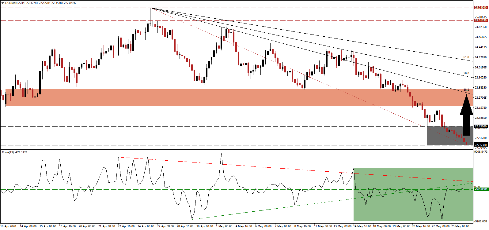 US economic data indicates more severe disruptions than planned for, while any recovery is in danger of a double-dip recession or the dreaded W-shaped pattern. Complacency by the US government regarding the long-term impact of the global Covid-19 pandemic, and consumer misconceptions about the labor market, limit the upside potential in the USD/MXN to its descending 38.2 Fibonacci Retracement Fan Resistance Level. It is passing through the short-term resistance zone located between 23.1797 and 23.5448, as identified by the red rectangle, favored to enforce the dominant long-term downtrend.