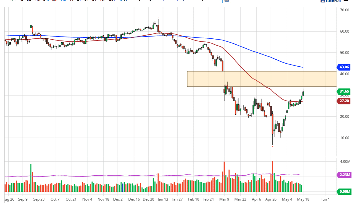 In order to expect crude oil to simply take off for a longer-term move upwards, you would have to leave that the demand is suddenly going to skyrocket. It clearly is not, and one only has to look at the airline industry to understand that to be true. Having said that, I remain steadfast in my bearishness over the longer term, but clearly now is not the time to be shorting. I suspect you will get that opportunity soon, but I would also be a seller below the $30 level, and most clearly below the recent consolidation. Short-term day traders may try to take long positions, but keep in mind that we are getting at dangerously high levels. You must be quick to take your profits if you are going to do this, but if you are more of a swing trader like I am it is simply a matter of waiting for an opportunity to get short. That opportunity has not presented itself quite yet.