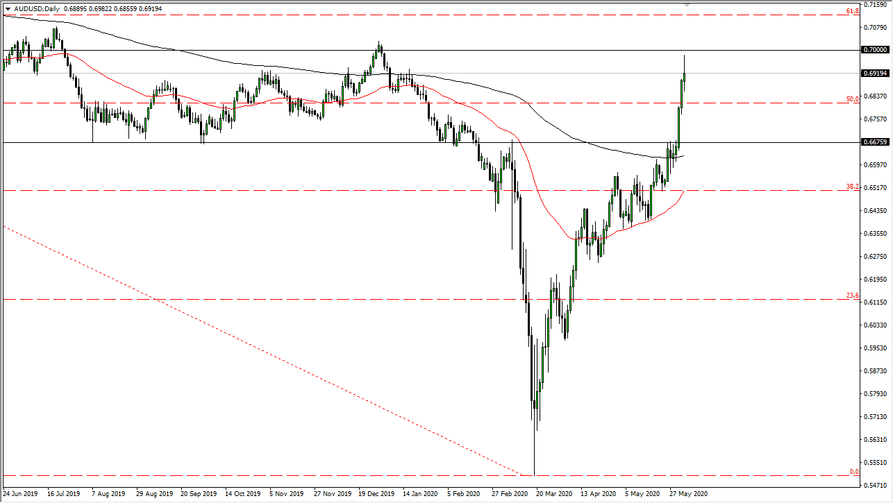 The Australian dollar has been all over the place during the trading session on Wednesday, as we approach the 0.70 level. The 0.70 level of course is a large, round, psychologically significant figure, so I think it makes quite a bit of sense that we struggle to get up here. Furthermore, the market has overextended itself by just about any metric you can use. While the Reserve Bank of Australia has suggested that the idea of negative interest rates are out of the question, this has been one of the main drivers of Australian dollar buying. Furthermore, as the economy has opened up rather substantially in China, the idea is that the Chinese will need more of the Australian commodities.