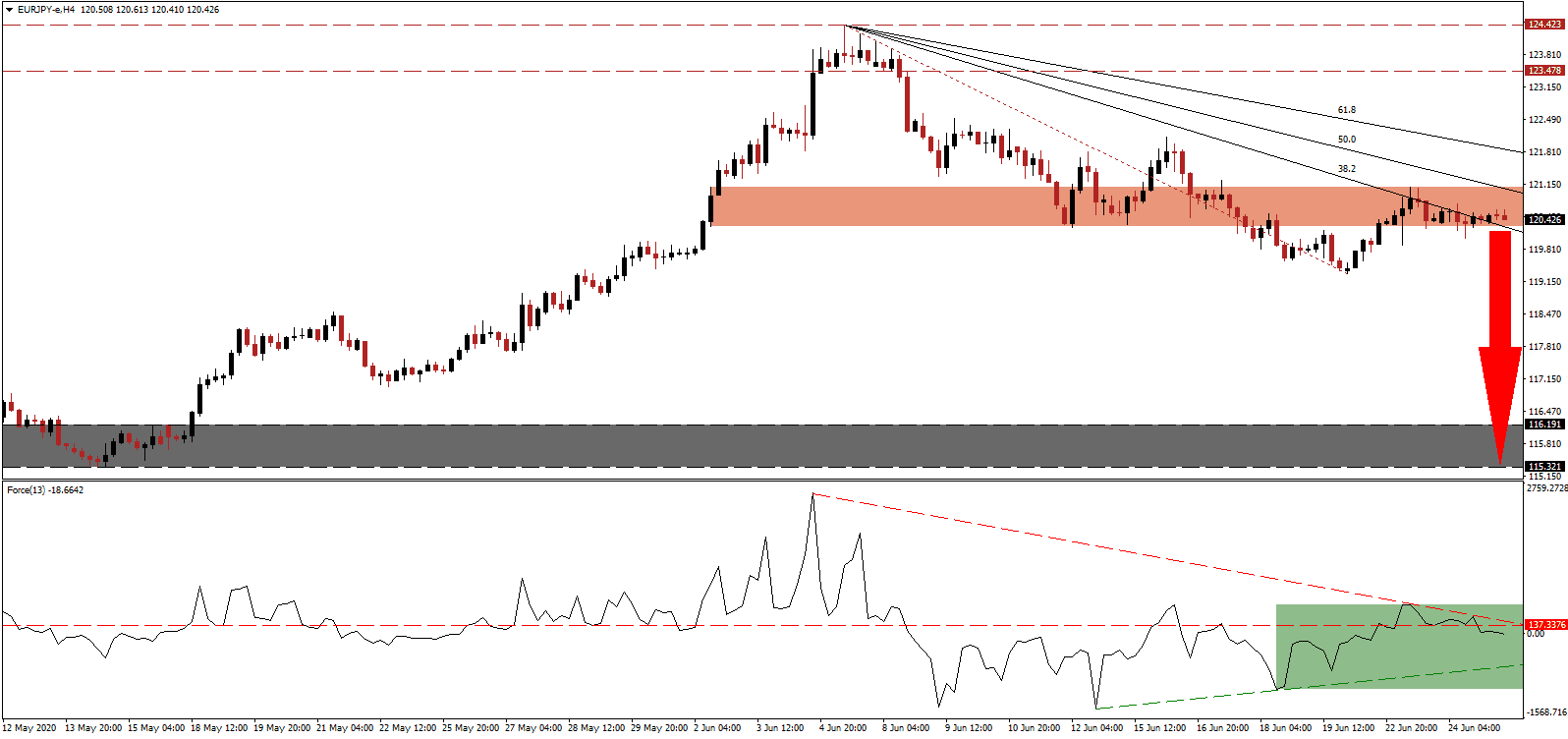 Safe-haven demand for the Japanese Yen, the primary currency for risk-averse traders, is expected to add to selling pressure in this currency pair. Economic data out of Japan remains grim, and the government is preparing for a new surge in Covid-19 infections. It highlighted concern over new clusters forming in office buildings. The descending 50.0 Fibonacci Retracement Fan Resistance Level is anticipated to enforce the corrective phase in the EUR/JPY, as the Eurozone is faced with more economic pressure from Trump’s renewed tariff threat. A breakdown will clear the path for price action to accelerate into its support zone located between 115.321 and 116.191, as marked by the grey rectangle.